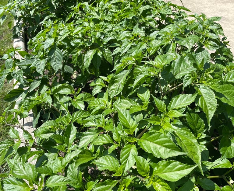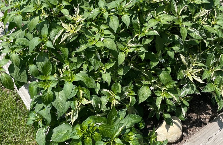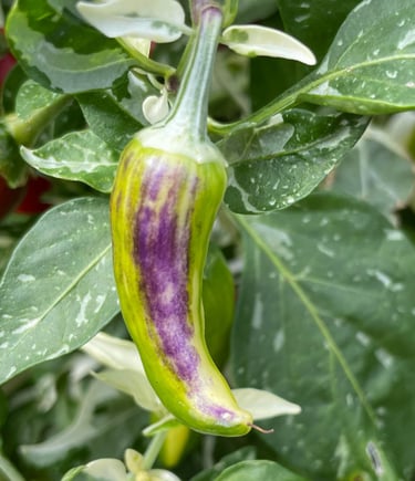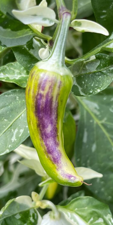 These are my favorite peppers to grow! These green and white beauties were first cultivated in the Mid-Atlantic states, and were used to flavor many seafood recipes, so they were named "Fish". The bright white is a sharp and lovely contrast to the otherwise dark green leaves. The coloration extends to the peppers which are pale green and white, when they are small, changing to green and white stripes, then to red and white, (some get purple in the process) and finally a brilliant red when at their hottest.