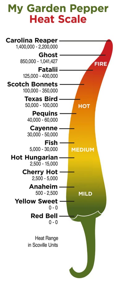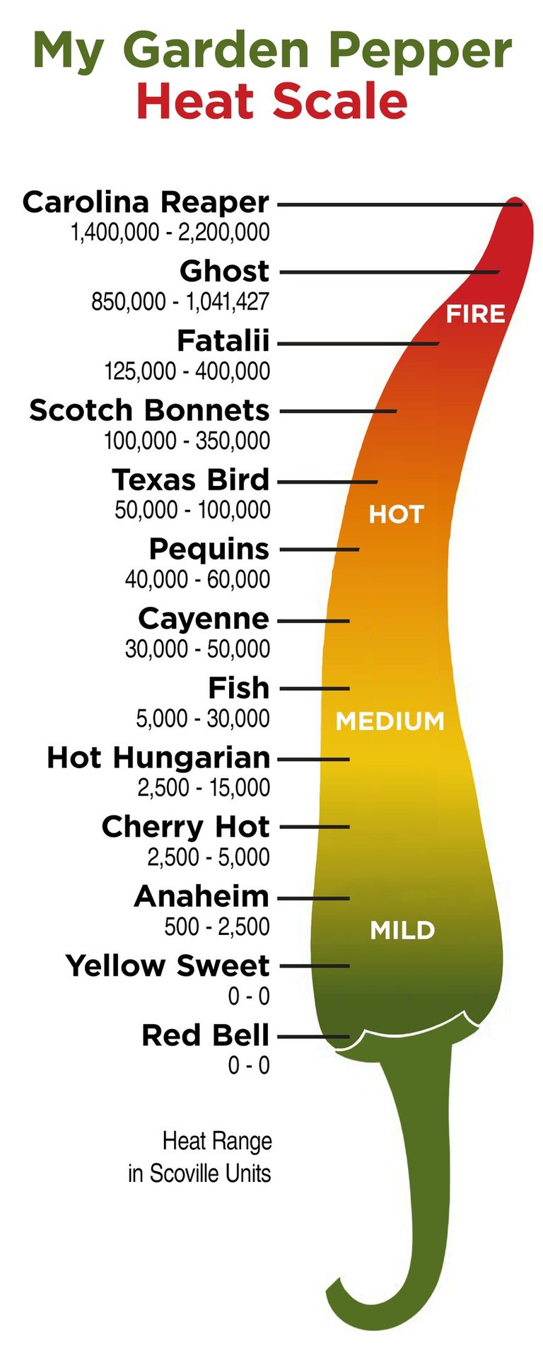 The pepper heat scale on the right gives you the SHUs of the varieties growing in our garden this year.